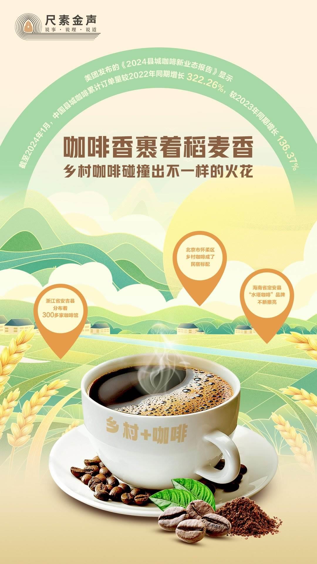 咖啡香裹著稻麥香,吹遍田野?!翱Х?”成為鄉(xiāng)村旅游新業(yè)態(tài)。美團(tuán)發(fā)布的《2024縣城咖啡新業(yè)態(tài)報(bào)告》顯示,截至2024年1月,中國縣城咖啡累計(jì)訂單量較2022年同期增長322.26%,較2023年同期增長136.37%。鄉(xiāng)村咖啡火出圈,背后靠什么?