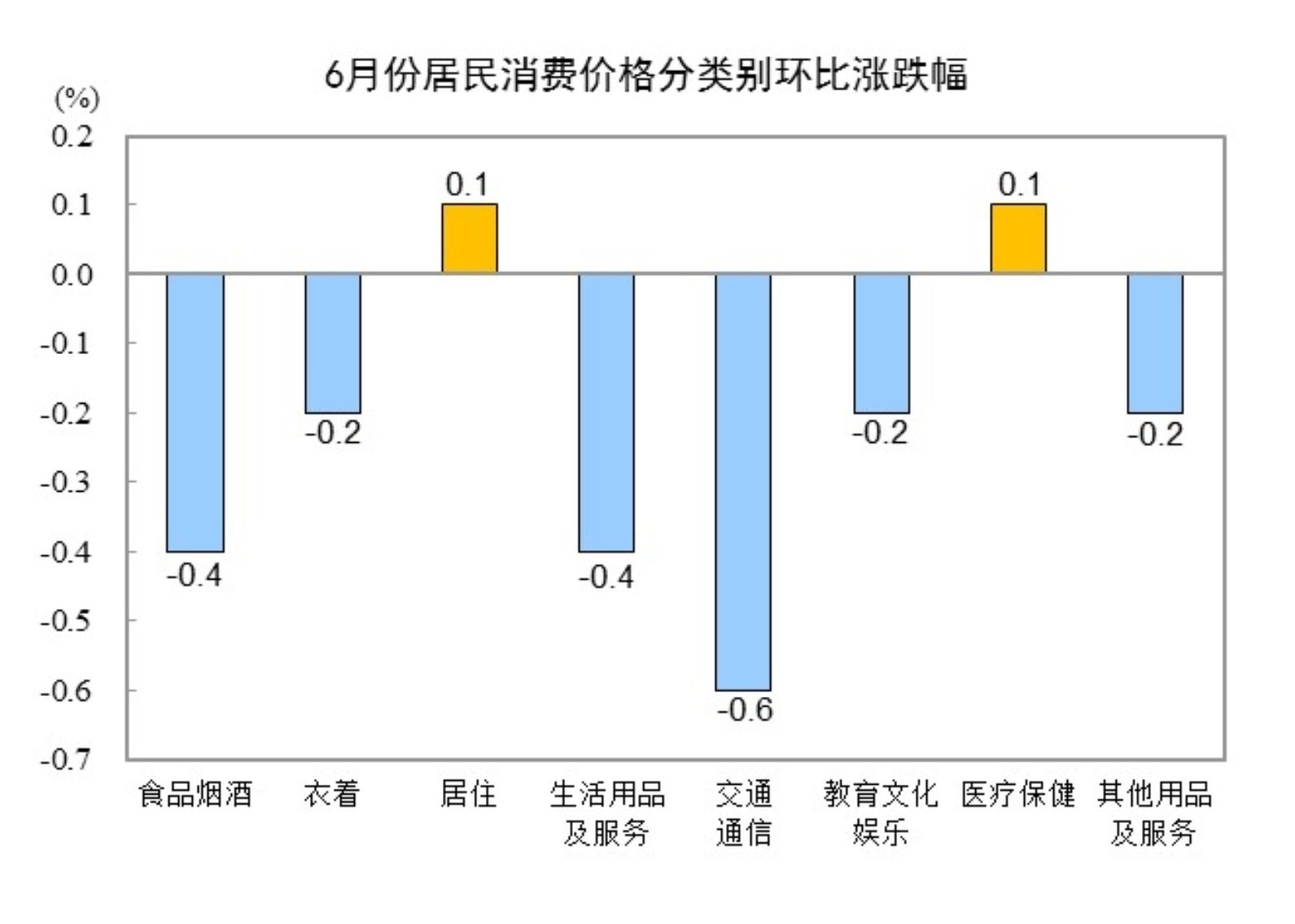 6月份,全國(guó)居民消費(fèi)價(jià)格環(huán)比下降0.2%。其中,城市下降0.2%,農(nóng)村下降0.2%;食品價(jià)格下降0.6%,非食品價(jià)格下降0.2%;消費(fèi)品價(jià)格下降0.4%,服務(wù)價(jià)格持平。
