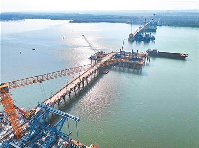 江西省南昌市南昌縣昌南大橋項(xiàng)目施工現(xiàn)場,工人在加緊推進(jìn)橋梁承臺(tái)和引橋建設(shè)。