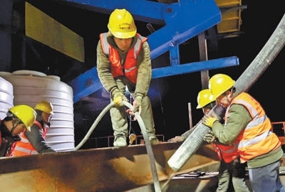 寒風(fēng)勁吹,杭州灣跨海鐵路大橋建設(shè)現(xiàn)場依舊熱火朝天,千余名建設(shè)者正在緊張地進(jìn)行大橋橋墩墩身施工作業(yè)。