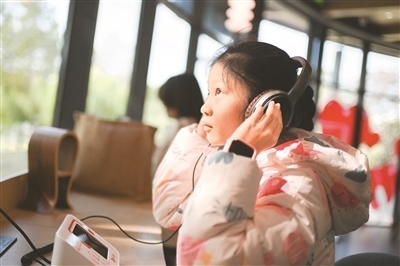 2024年11月24日,小朋友在江蘇省昆山市圖書(shū)館城市公園分館收聽(tīng)“有聲森林”音頻。