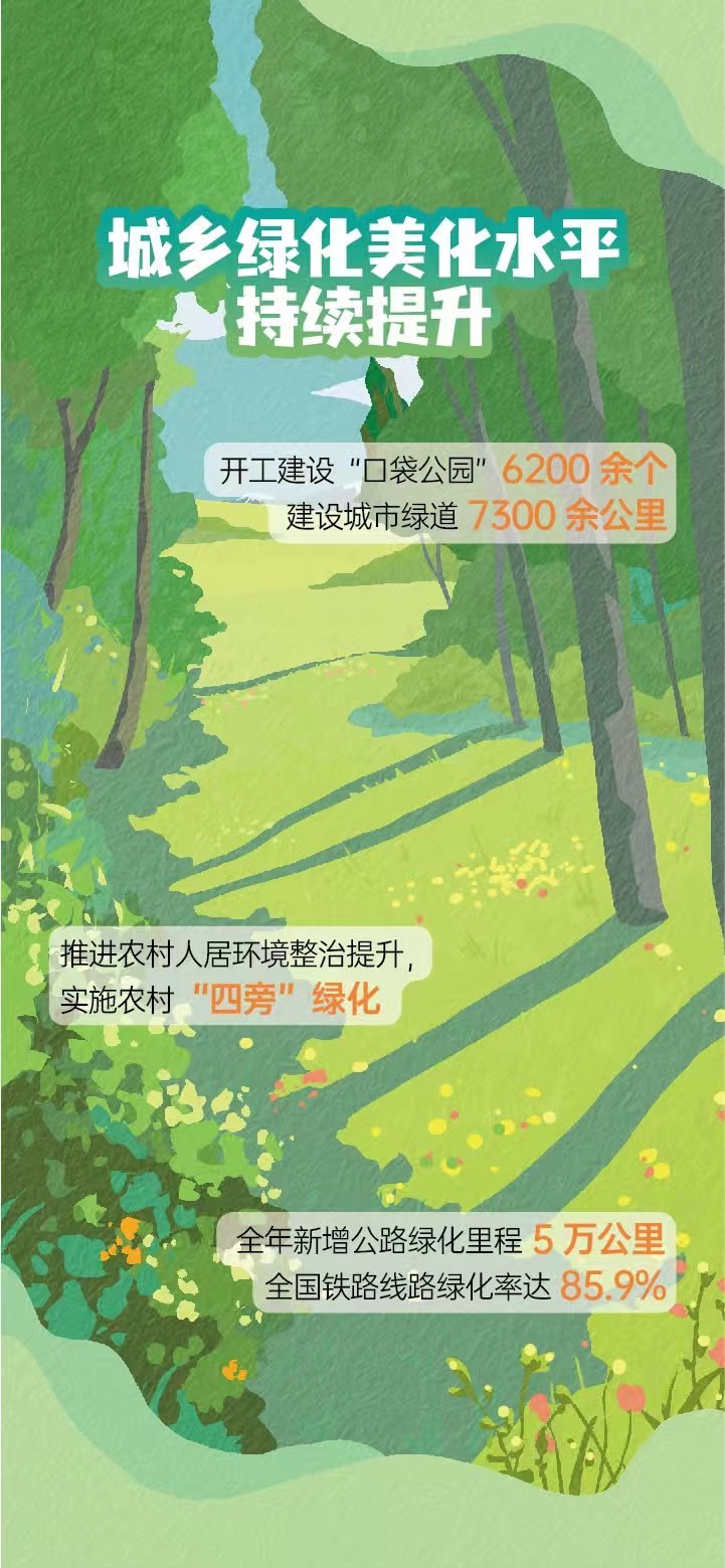 張利明介紹,過去一年,山水林田湖草沙系統(tǒng)治理取得新進(jìn)展,城鄉(xiāng)綠化美化水平持續(xù)提升。組織實(shí)施176個“雙重”工程項目、10個國土綠化示范項目。推進(jìn)實(shí)施“十四五”27個山水林田湖草沙一體化保護(hù)和修復(fù)工程項目、49個歷史遺留廢棄礦山生態(tài)修復(fù)示范工程項目。森林可持續(xù)經(jīng)營實(shí)施面積擴(kuò)大到66.7萬公頃以上。全國林草碳匯試點(diǎn)市(縣)和國有林場碳匯試點(diǎn)實(shí)施面積達(dá)6.8萬公頃。新增水土流失治理面積6.4萬平方公里。開工建設(shè)“口袋公園”6200余個,建設(shè)城市綠道7300余公里。新增公路綠化里程5萬公里,全國鐵路線路綠化率達(dá)85.9%。