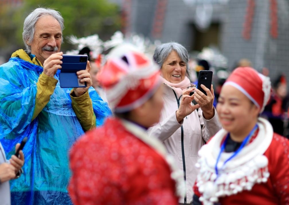 4月12日,外國游客在貴州省黔東南苗族侗族自治州臺(tái)江縣舉行的“苗族姊妹節(jié)”慶祝活動(dòng)上拍攝。新華社記者劉續(xù) 攝