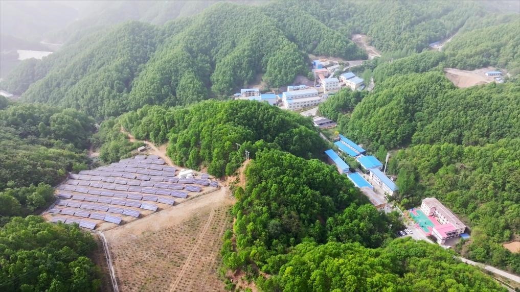 驅(qū)車駛?cè)肼鍖幙h伏牛山區(qū),在紫金礦業(yè)集團旗下的洛陽坤宇礦業(yè)有限公司,已閉庫的尾礦庫上,光伏電板依山勢整齊排列,深藍色的面板與周邊翠綠的樹木交相輝映,科技感十足。