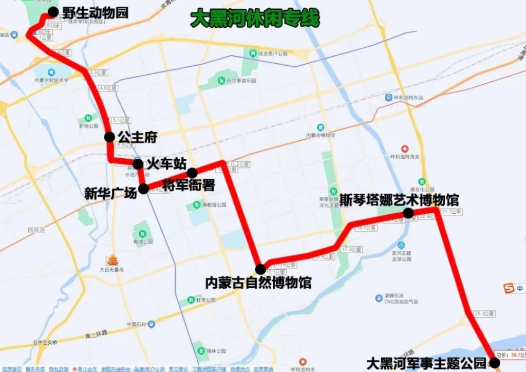 大黑河休閑專線(大青山野生動物園——大黑河軍事主題公園),途經(jīng):Y317、通道北路、車站西街、錫林北路、新華大街、興安南路、金橋路、大黑河北岸路。沿途設(shè)站:野生動物園、公主府、火車站、新華廣場、將軍衙署、內(nèi)蒙古自然博物館、斯琴塔娜藝術(shù)博物館、大黑河軍事主題公園,單程:30.7公里,配車:8—10臺。