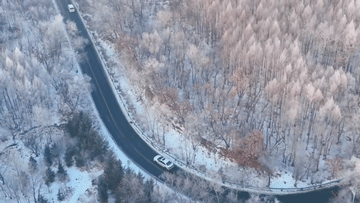 山峰、樹木都被冰雪點(diǎn)綴,粉妝玉砌,銀光閃爍。晶瑩剔透的霧凇與蜿蜒的山路交相輝映,構(gòu)成了一幅壯觀的冬雪美麗畫卷。