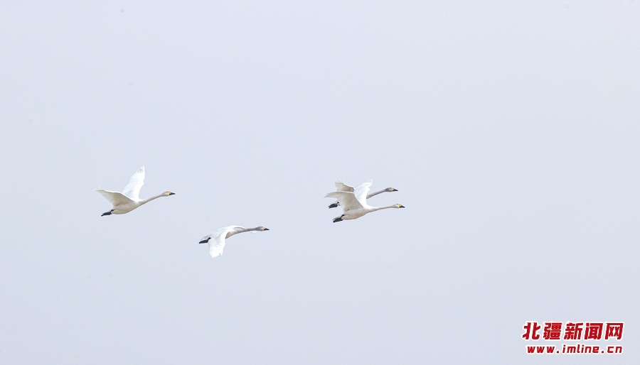 3月11日,幾只天鵝從黃河呼和浩特托克托縣段上空飛過。近日,隨著北方氣溫逐漸回升,黃河托克托縣段冰河加速開河。 樂炎攝影報道