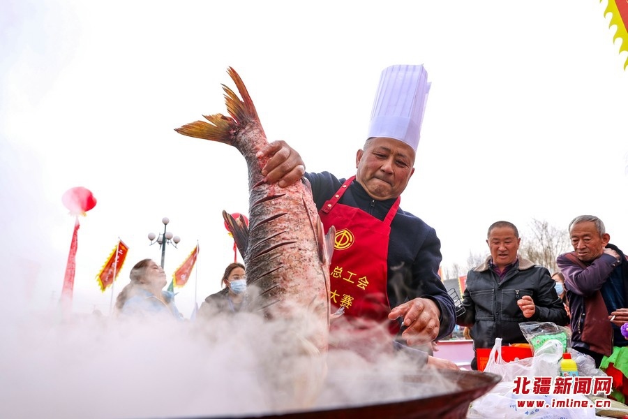3月11日,托克托縣“黃河開河魚節(jié)”上,廚師正在烹飪開河魚。近日,隨著北方氣溫逐漸回升,黃河托克托縣段冰河加速開河。 樂炎攝影報道