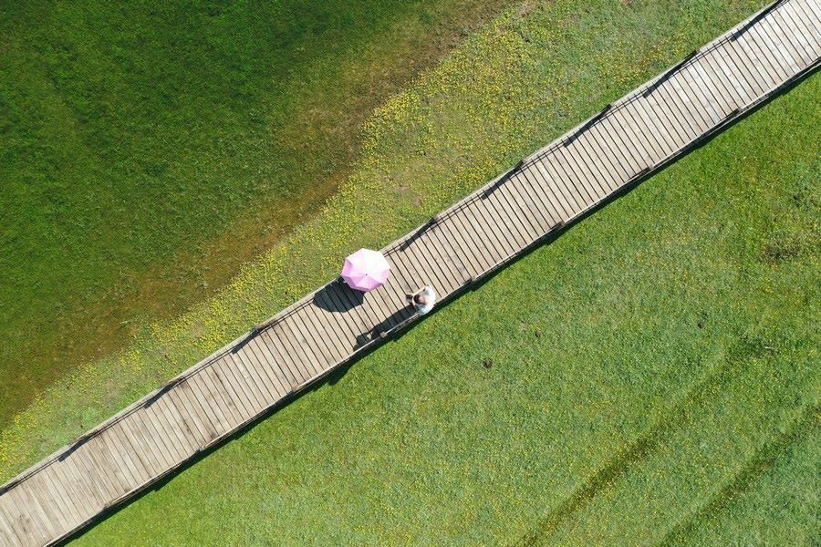 游客在石人灣濕地拍照打卡