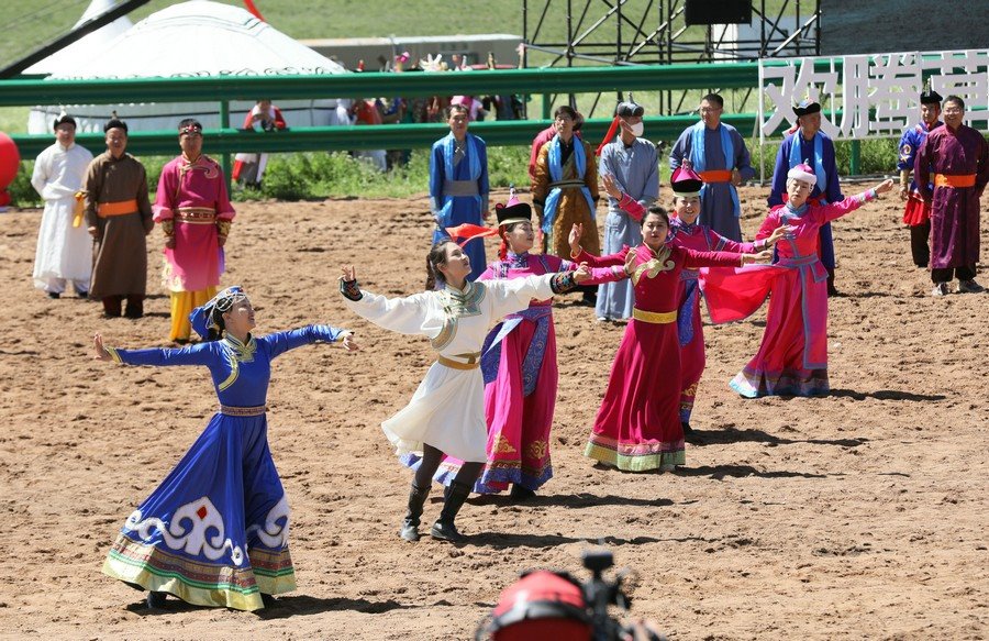 文藝演出結(jié)束后,進(jìn)行了傳統(tǒng)的那達(dá)慕賽事項(xiàng)目。賽馬場上群馬奔騰、塵土飛揚(yáng),場面蔚為壯觀,騎手們揚(yáng)鞭策馬,展現(xiàn)出精湛的騎術(shù),贏得觀眾陣陣歡呼。摔跤場上,搏克手你來我往互不相讓,斗智斗勇……