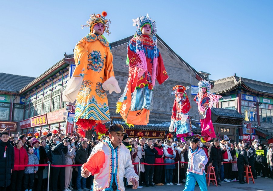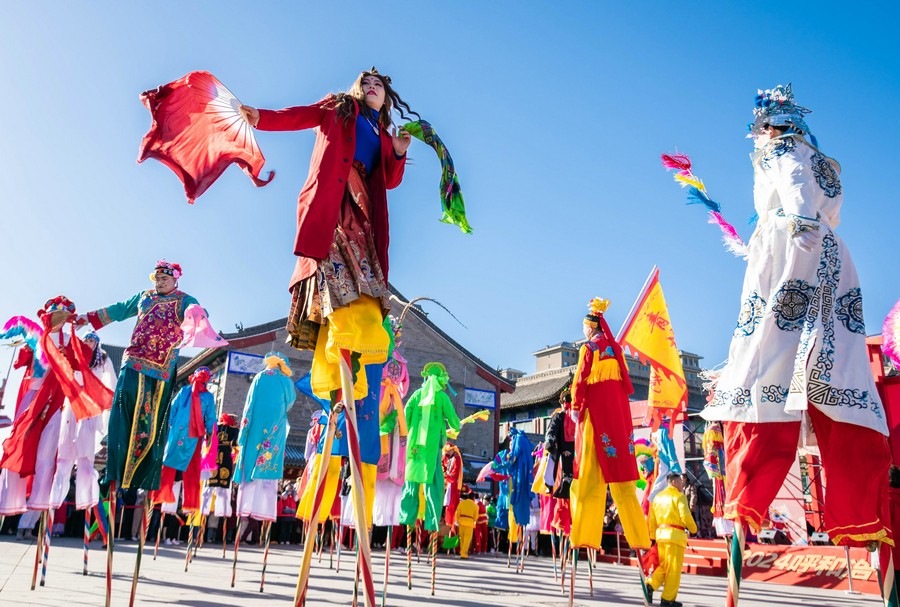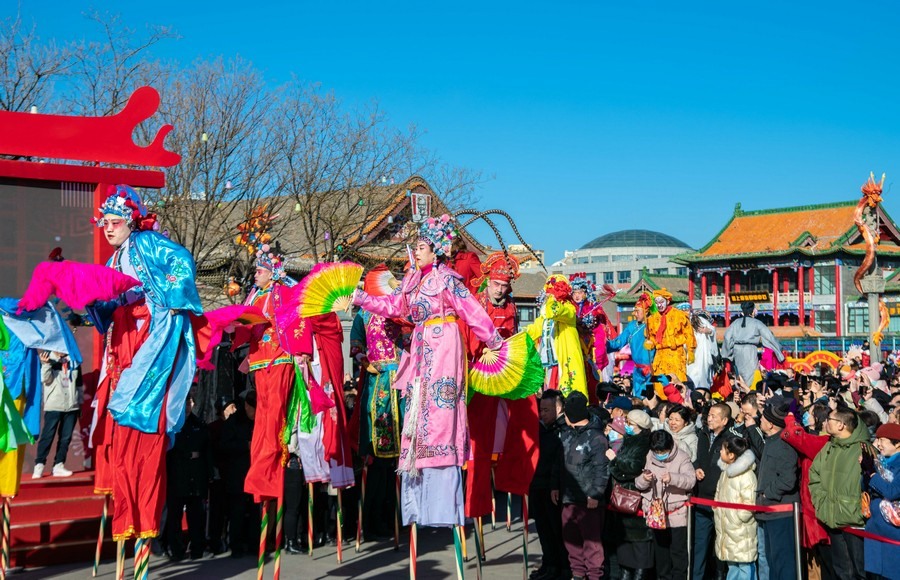 2024年2月15日,民間藝人在呼和浩特新春文化廟會現(xiàn)場進行踩高蹺表演。丁根厚 攝