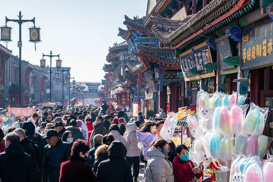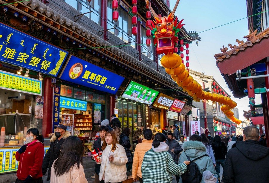 2024年2月15日,人們在呼和浩特市玉泉區(qū)塞上老街旅游休閑街區(qū)游玩。丁根厚 攝
