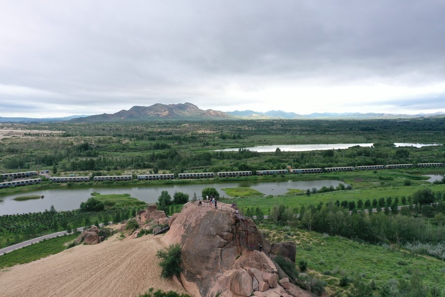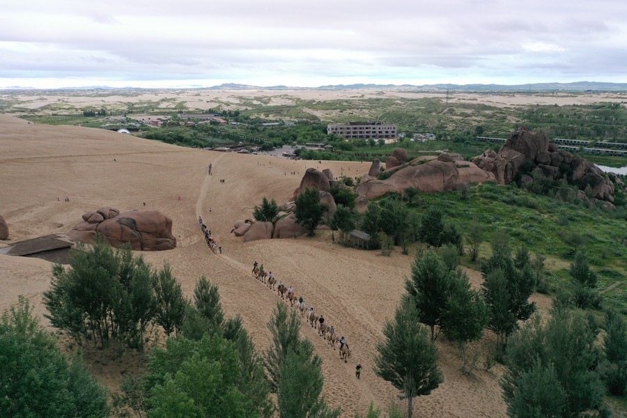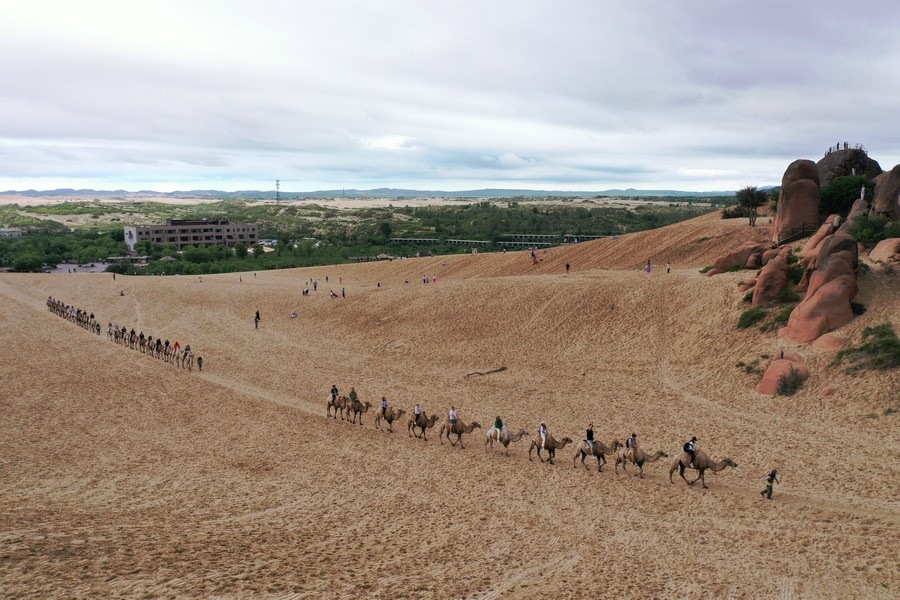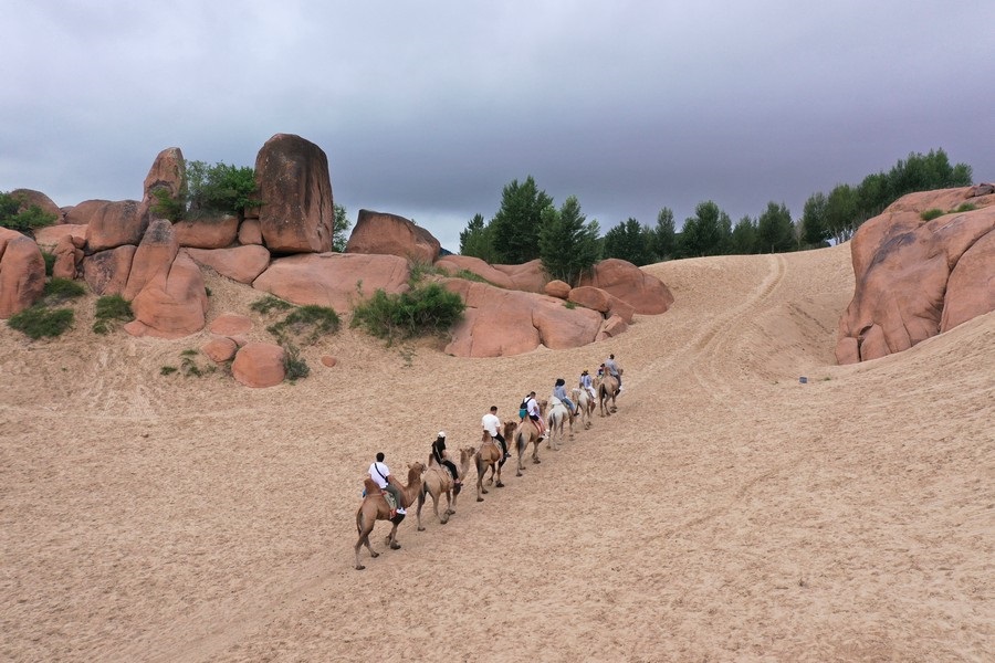 7月31日,雨后的玉龍沙湖空氣清新,游客在玉龍沙湖景區(qū)越野穿沙、騎駱駝游玩,欣賞沙海奇觀。