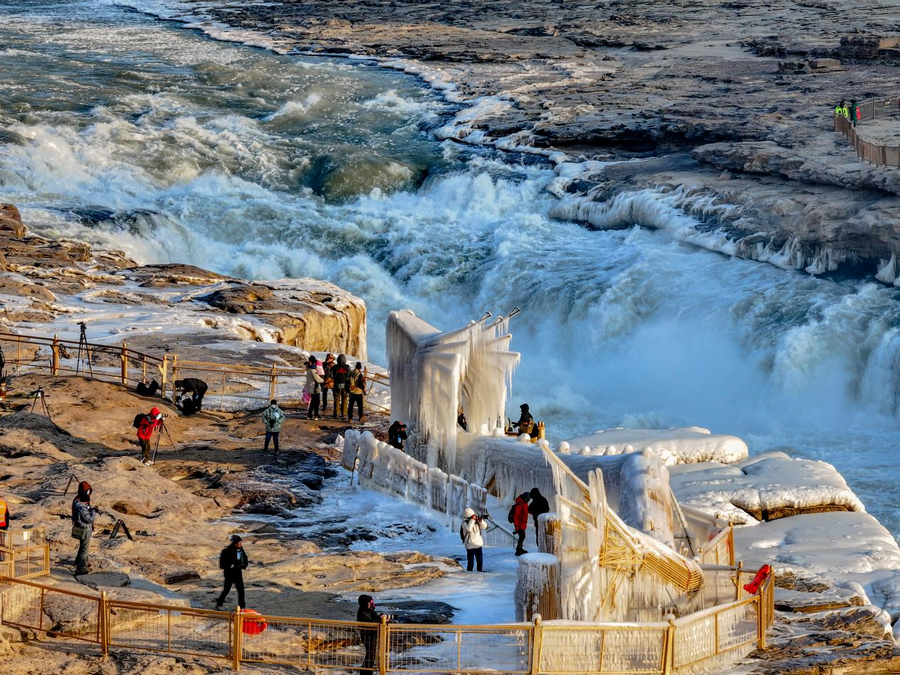 2月6日,受近日持續(xù)降溫天氣影響,位于秦晉大峽谷的陜西壺口瀑布景區(qū)出現(xiàn)冰瀑玉壺景觀。從空中俯瞰,滔滔黃河水奔騰咆哮,場(chǎng)面蔚為壯觀,飛濺起的浪花和彌漫的水霧在兩岸巖石和護(hù)欄上迅速凝結(jié),形成形狀各異的冰掛,晶瑩剔透,美不勝收,飛瀑上空偶現(xiàn)的彩虹與冰掛同框,交相輝映。由于近期黃河水流量上漲,達(dá)到700立方米每秒,景區(qū)主側(cè)瀑布攜手傾瀉,呈現(xiàn)“90版50元人民幣”上的壯美瀑布景觀,游客一次旅程可觀看雙瀑奇觀。
