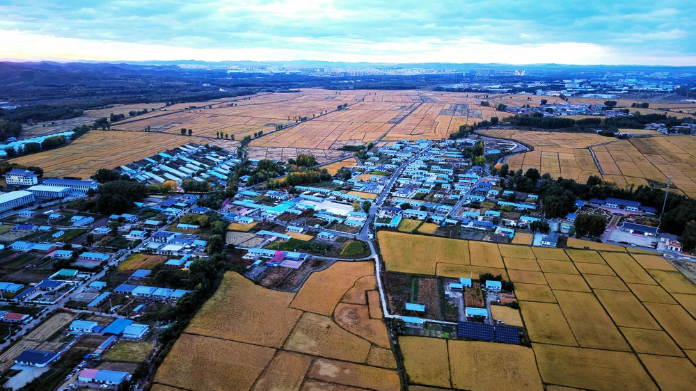 9月25日,空中俯瞰暮色中的三合村,遠(yuǎn)山如黛,稻田如畫,金色的麥浪,映襯著豐收的底色。