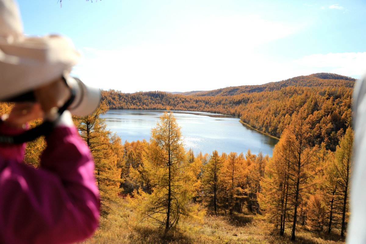 9月29日,游客在內(nèi)蒙古阿爾山國家森林公園烏蘇浪子湖邊打卡 北疆新聞記者 張楊攝影