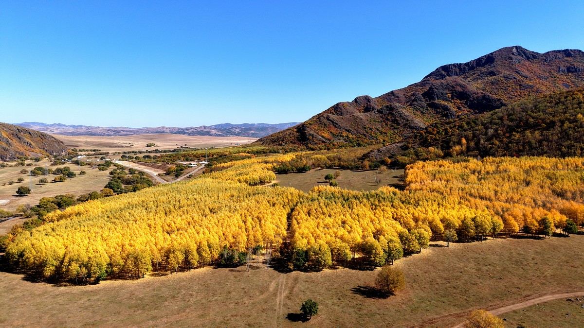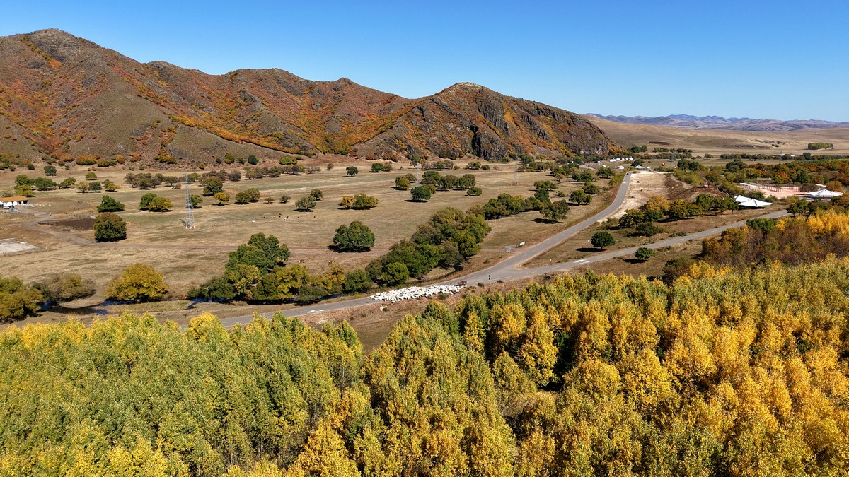 黑羊山旅游度假區(qū),海拔1319米,因這里的山形似黑羊頭得名。金秋時節(jié),整個景區(qū)被一片五彩斑斕的世界所籠罩,藍天、白云、溪流、牛羊群構成一幅醉人的畫卷,恍若進入童話世界。