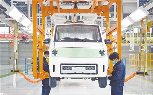 12月12日,工人在總裝車間組裝新能源快遞車。當日,由山東豪馳智能汽車有限公司投資、中建電力建設有限公司承建的智能新能源商用車制造基地在山東濟南市萊蕪區(qū)投產(chǎn)。新華社記者 金良快攝