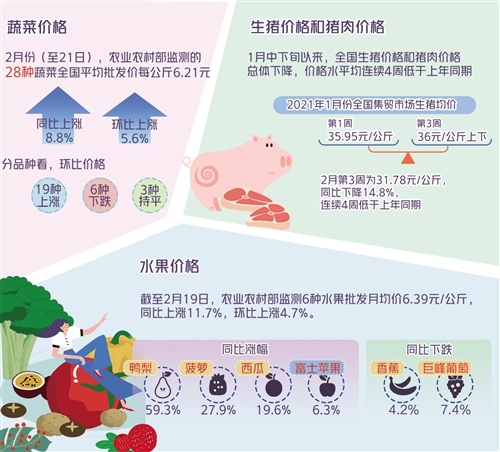 2月份(至21日),農(nóng)業(yè)農(nóng)村部監(jiān)測(cè)的28種蔬菜全國平均批發(fā)價(jià)每公斤6.21元,同比上漲8.8%,環(huán)比上漲5.6%,較近三年2月份平均環(huán)比漲幅收窄了10.1個(gè)百分點(diǎn)。分品種看,環(huán)比價(jià)格19種上漲,6種下跌,3種持平,其中漲幅超過20%的只有黃瓜(32.4%)、豆角(25.2%)和冬瓜(21.6%)3種。從周價(jià)看,第8周(2月15日至21日)蔬菜批發(fā)均價(jià)每公斤6.13元,環(huán)比下跌4.2%,呈節(jié)后迅速季節(jié)性下行趨勢(shì)。