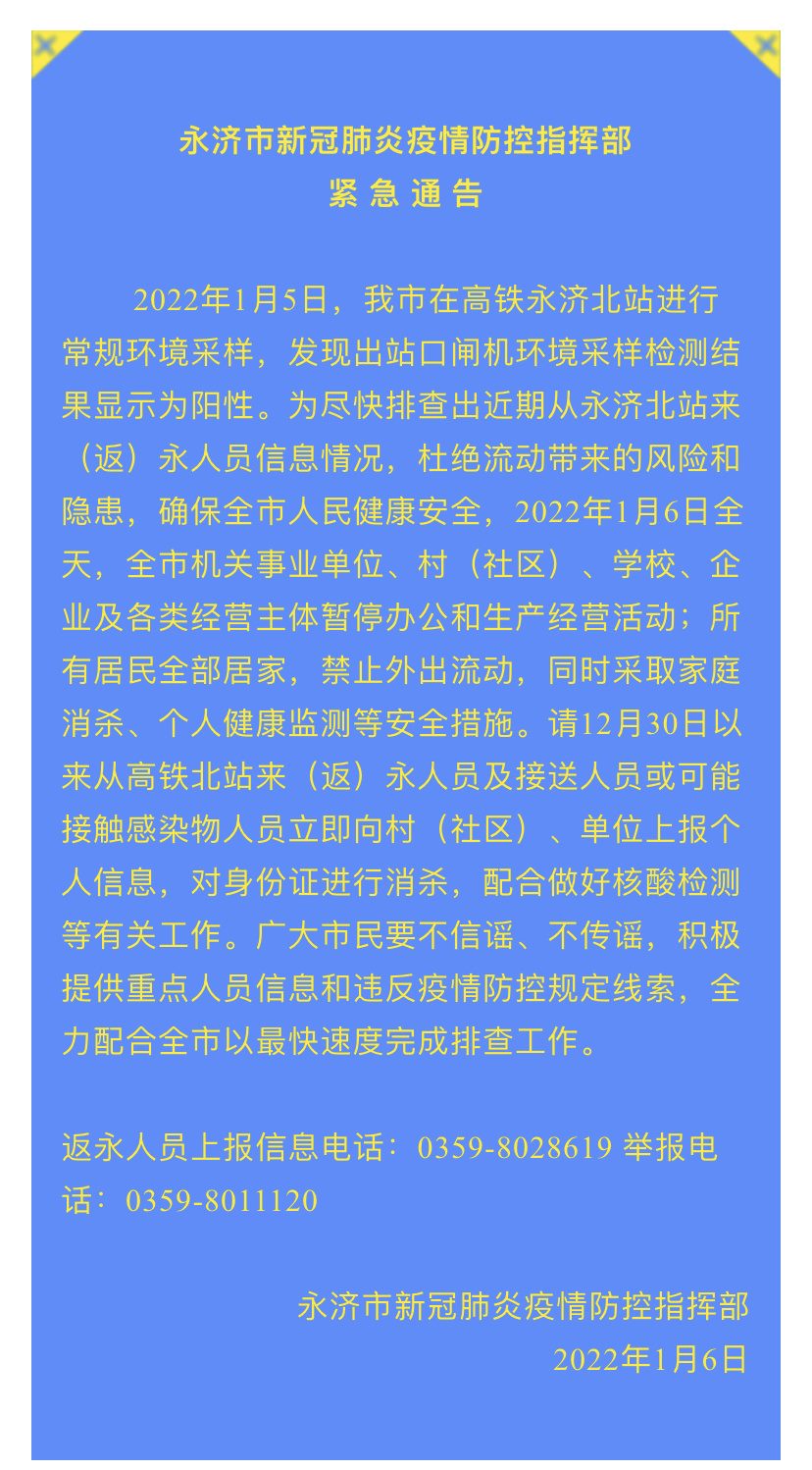2022年1月5日,山西省永濟(jì)市在高鐵永濟(jì)北站進(jìn)行常規(guī)環(huán)境采樣,發(fā)現(xiàn)出站口閘機(jī)環(huán)境采樣檢測(cè)結(jié)果顯示為陽(yáng)性。為盡快排查出近期從永濟(jì)北站來(lái)(返)永人員信息情況,杜絕流動(dòng)帶來(lái)的風(fēng)險(xiǎn)和隱患,確保全市人民健康安全,1月6日全天,全市機(jī)關(guān)事業(yè)單位、村(社區(qū))、學(xué)校、企業(yè)及各類(lèi)經(jīng)營(yíng)主體暫停辦公和生產(chǎn)經(jīng)營(yíng)活動(dòng);所有居民全部居家,禁止外出流動(dòng),同時(shí)采取家庭消殺、個(gè)人健康監(jiān)測(cè)等安全措施。請(qǐng)12月30日以來(lái)從高鐵北站來(lái)(返)永人員及接送人員或可能接觸感染物人員立即向村(社區(qū))、單位上報(bào)個(gè)人信息,對(duì)身份證進(jìn)行消殺,配合做好核酸檢測(cè)等有關(guān)工作。廣大市民要不信謠、不傳謠,積極提供重點(diǎn)人員信息和違反疫情防控規(guī)定線索,全力配合全市以最快速度完成排查工作。