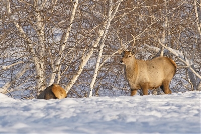 野生赤鹿來(lái)“蹭吃蹭喝”。