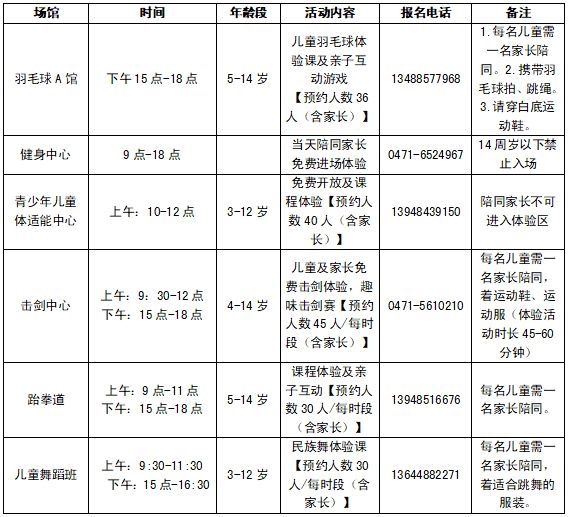 記者從內(nèi)蒙古體育館了解到,六一兒童節(jié)當(dāng)日,該館羽毛球、健身中心、青少年兒童體適能中心、擊劍中心、跆拳道、兒童舞蹈班為14周歲以下的兒童準備了豐富的免費體驗活動項目。