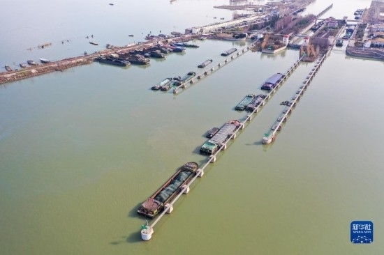 2月14日,貨船有序通過(guò)位于江蘇宿遷的京杭大運(yùn)河皂河船閘(無(wú)人機(jī)照片)。