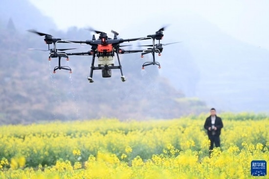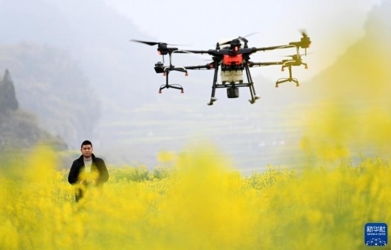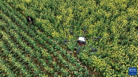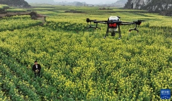 2月17日,在貴州省六盤(pán)水市六枝特區(qū)木崗鎮(zhèn)油菜基地,農(nóng)技人員利用植保無(wú)人機(jī)進(jìn)行春管。