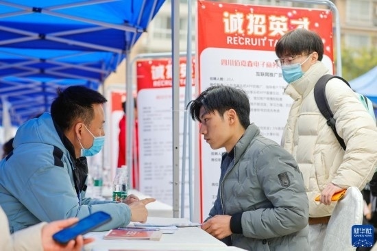 2月17日,在中國成都人力資源服務產業(yè)園,求職者(中)與招聘企業(yè)工作人員交流。