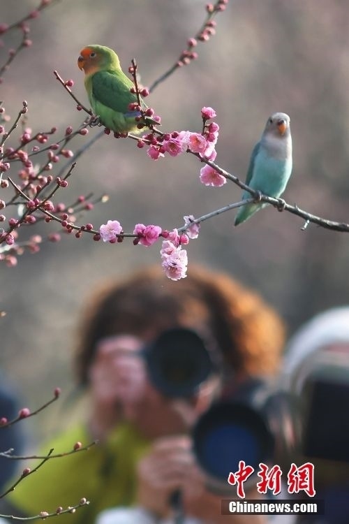 2月20日,江蘇南京,牡丹鸚鵡在梅花山梅花樹上“賞”梅,吸引市民拍照。牡丹鸚鵡由南京一市民飼養(yǎng),每年在梅花盛開的時(shí)候,他都會(huì)帶著鸚鵡來(lái)到這里“賞”梅,同時(shí)也成為一景。 中新社記者 泱波 攝