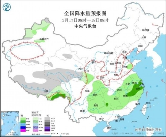 3月16日08時(shí)至17日08時(shí),新疆沿天山地區(qū)、西藏東部、山西北部、川西高原北部等地部分地區(qū)有小到中雪。黃淮西部、江淮西部和南部、江漢大部、江南北部和西部、西南地區(qū)東南部等地部分地區(qū)有中到大雨,其中,湖南北部和西部、貴州中東部等地部分地區(qū)有暴雨(50~70毫米),并伴有短時(shí)雷暴大風(fēng)、冰雹等強(qiáng)對(duì)流天氣。