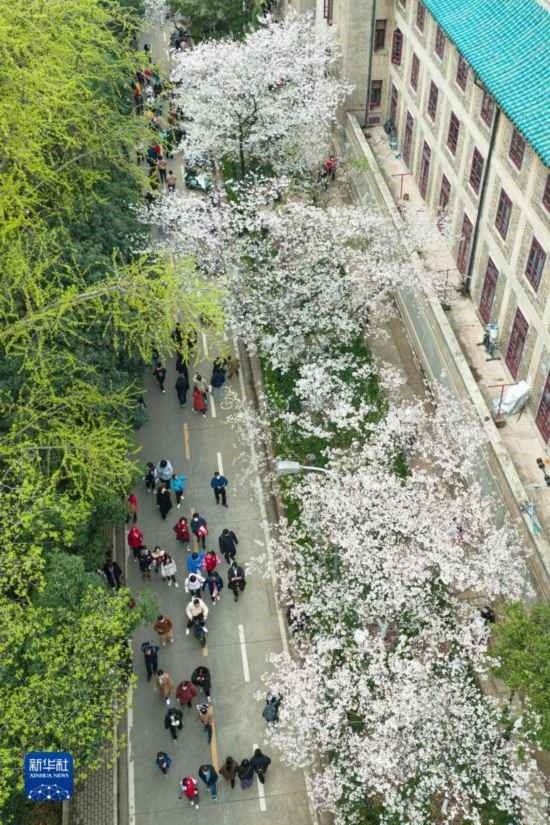 3月18日,來自各地的抗疫醫(yī)護人員及家屬在武漢大學校園賞櫻(無人機照片)。