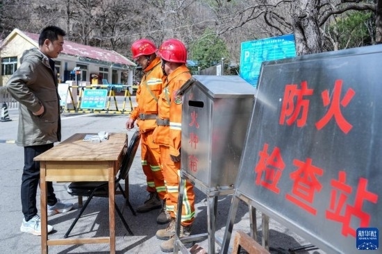 3月15日,長清區(qū)國有蓮臺山林場防火中隊(duì)隊(duì)員在林區(qū)入口檢查火源。