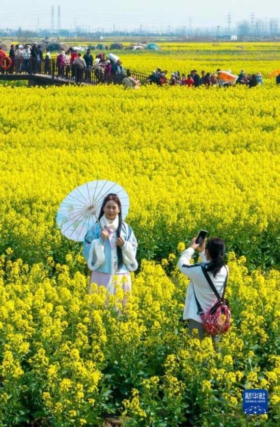 3月19日,游客在江蘇興化千垛菜花風(fēng)景區(qū)賞花拍照(無人機照片)。
