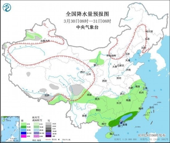 3月30日08時(shí)至31日08時(shí),新疆沿天山地區(qū)和伊犁河谷、西藏東部和南部、川西高原北部等地部分地區(qū)有小雪或雨夾雪。廣西東南部、廣東中南部、福建南部等地的部分地區(qū)有中到大雨,局地有暴雨(50~55毫米)。新疆北疆北部等地部分地區(qū)有5~7級(jí)風(fēng)(見圖3)。
