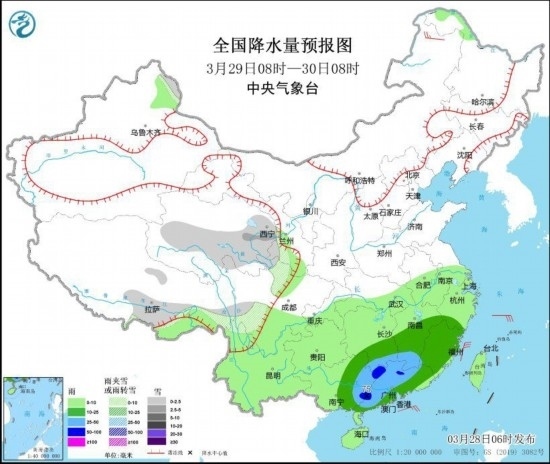 圖2 全國降水量預(yù)報(bào)圖(3月29日08時(shí)-30日08時(shí))