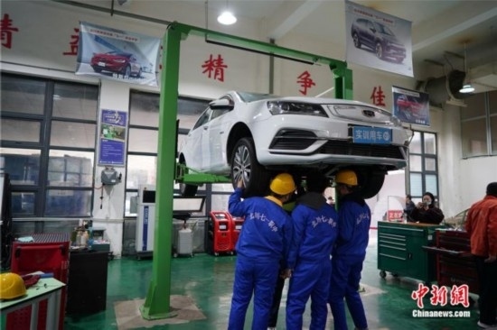 學(xué)生們正在老師指導(dǎo)下進(jìn)行汽車維護(hù)保養(yǎng)、機械故障診斷等操作。中新網(wǎng)記者 劉湃 攝