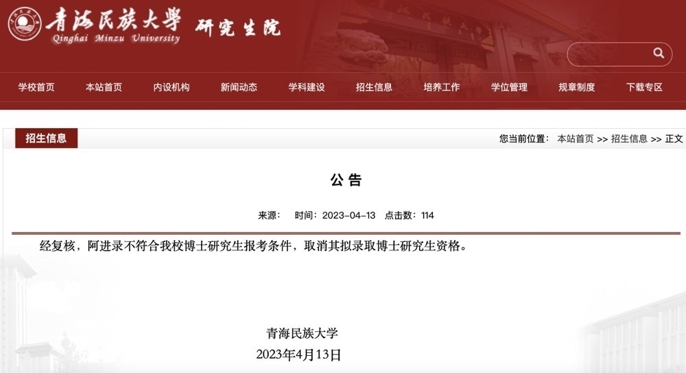 ·青海民族大學回應黨委副書記擬錄取為本校博士:取消資格。