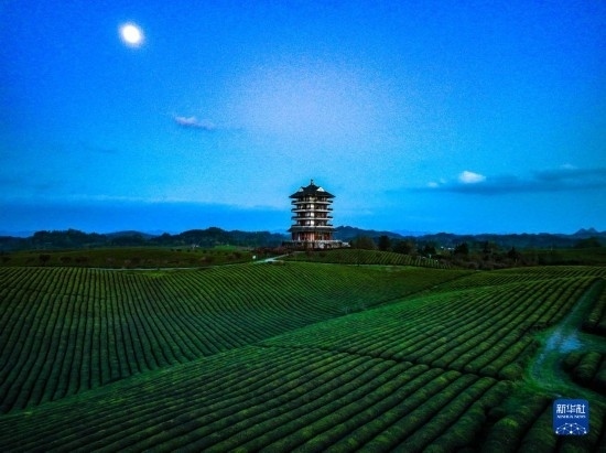 4月4日在遵義市湄潭縣永興鎮(zhèn)拍攝的月光下的“萬畝茶?!保o人機照片)。