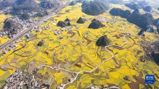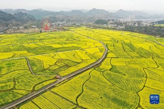 貴州省六盤水市六枝特區(qū)木崗鎮(zhèn)抵簸村的油菜花田(3月9日攝,無人機照片)。