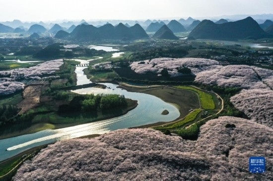 貴州省貴安新區(qū)櫻花園風貌(3月21日攝,無人機照片)。
