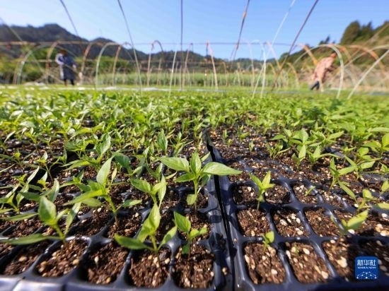 4月16日,在貴州省岑鞏縣注溪鎮(zhèn)注溪村,村民在辣椒育苗基地給辣椒苗澆水。