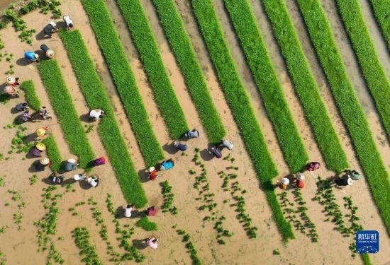 4月16日,在湖南省衡陽市祁東縣金橋鎮(zhèn),村民在扯秧(無人機(jī)照片)。