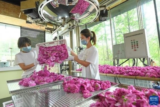 4月20日,工作人員處理剛采摘的玫瑰花,準備烘干。