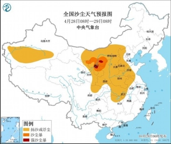受冷空氣大風影響,預計4月28日08時至29日08時,新疆南部、內(nèi)蒙古中西部、甘肅北部和東部、寧夏、陜西、四川盆地北部、山西、河北西部、河南、山東中西部、湖北、湖南北部、安徽北部、江蘇西北部等地的部分地區(qū)有揚沙或浮塵天氣,其中,內(nèi)蒙古西南部、甘肅東北部、寧夏中北部、陜西西北部等地的部分地區(qū)有沙塵暴,局地有強沙塵暴。中央氣象臺4月28日06時發(fā)布沙塵暴藍色預警。