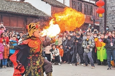 陜西省漢中市城固縣在上元觀古鎮(zhèn)開(kāi)展民俗傳統(tǒng)節(jié)目展演,吸引眾多游客觀賞。劉曉東攝(人民視覺(jué))