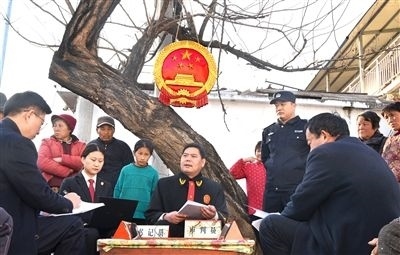 圖④:沂源法院東里人民法庭法官在中莊鎮(zhèn)河西一村現(xiàn)場(chǎng)開(kāi)庭審理案件。(資料圖片)