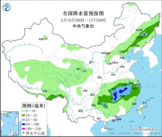 5月16日08時至17日08時,黑龍江東南部、吉林中東部、遼寧北部和西部、江漢東南部、江淮西南部、江南大部等地的部分地區(qū)有中到大雨,其中,湖北東南部、安徽南部、湖南東北部、江西北部等地局地有暴雨或大暴雨(100~110毫米)。西藏南部、內(nèi)蒙古中東部、吉林中部、遼寧西部、山西北部、河北東北部等地的部分地區(qū)有4~6級風。