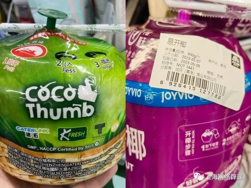 還有店員向記者推薦了價格更高的“椰子蛋”,即剝了一半皮的椰子,店員稱“椰子蛋”沒有開口,用吸管一戳就能把椰肉戳破,更衛(wèi)生一些。記者看到部分“椰子蛋”上的確標注了生產(chǎn)日期和保質(zhì)期(3天),看上去比預(yù)開口椰子更正規(guī)一些,卻又少了上市日期。而關(guān)于“為何預(yù)包裝的椰子類產(chǎn)品標識不同”的問題,店員都無法作答。