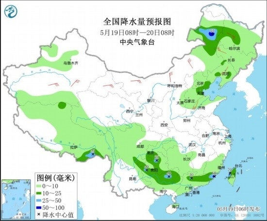 5月19日08時(shí)至20日08時(shí),內(nèi)蒙古東部、東北地區(qū)、華北中東部、新疆北部、西藏、西南地區(qū)東部和北部、江南西部和南部、華南大部等地部分地區(qū)有小到中雨,局地有大雨或暴雨(50~70毫米),上述部分地區(qū)伴有短時(shí)強(qiáng)降水,局地有雷暴大風(fēng)或冰雹等強(qiáng)對流天氣。內(nèi)蒙古、東北地區(qū)、西北地區(qū)東部等地部分地區(qū)有4~6級(jí)風(fēng)。